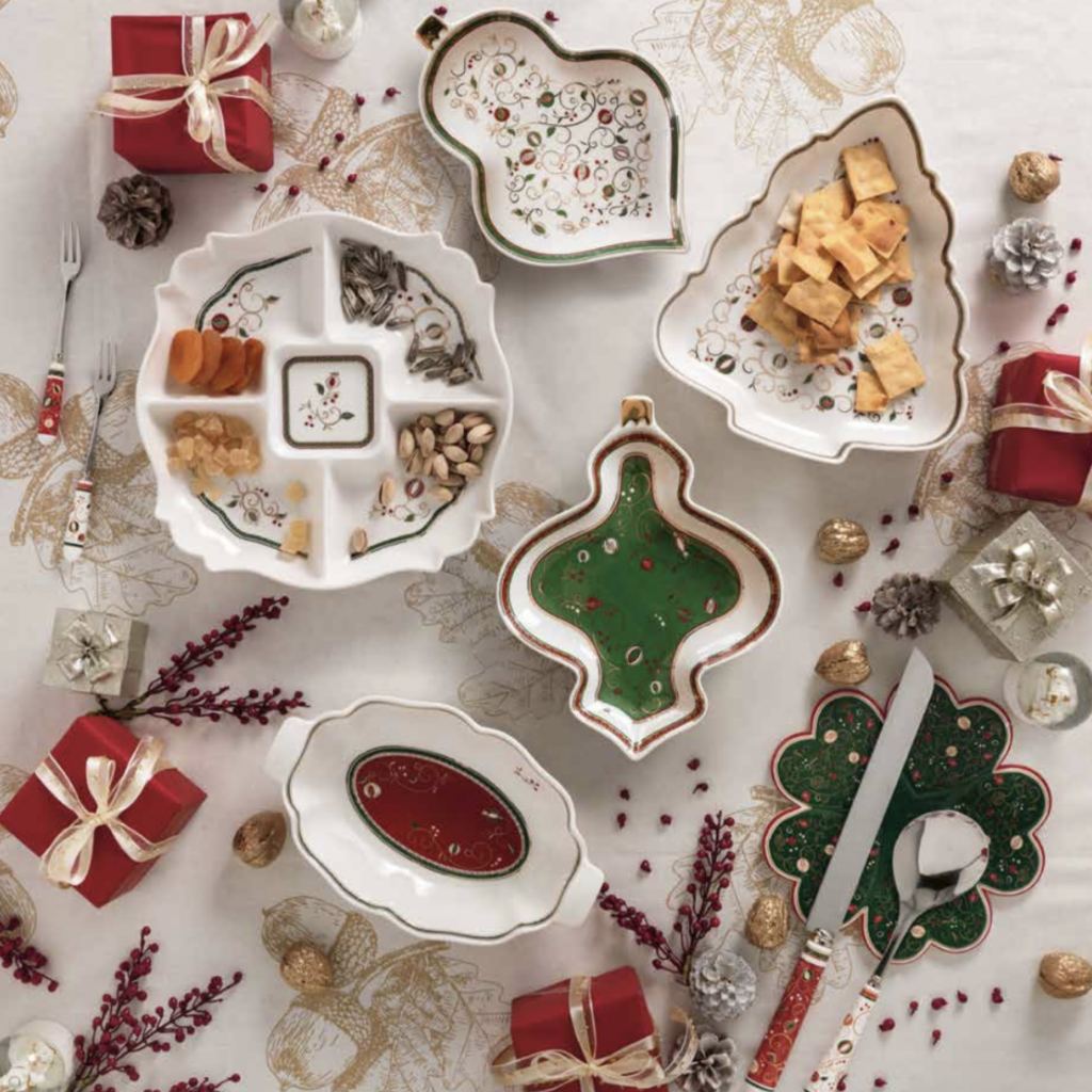 Da collocare al centro del tavolo i piatti di servizio, valuta l’uso di piatti girevoli, molto pratici perchè permettono ai commensali di servirsi con facilità, ed eleganti alzate con cui servire le portate a decorare la tavola. Non dimenticare i piatti per dolce e frutta, indispensabili a Natale!