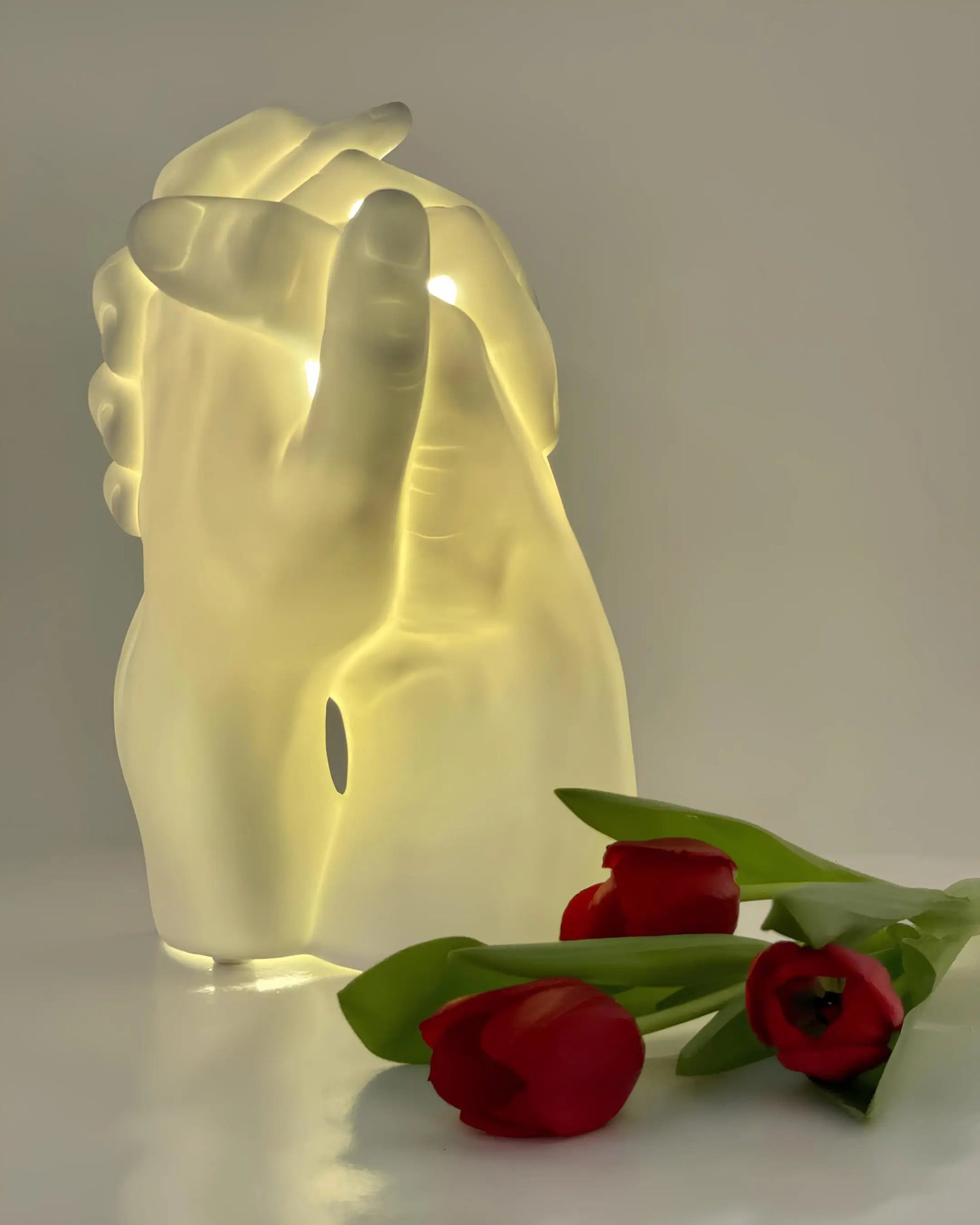 Due mani che si intrecciano, simbolo di unione e affetto. With Me Lamp di Marcantonio per Seletti illumina con una luce calda e delicata, trasformando un gesto d’amore in un dono prezioso.