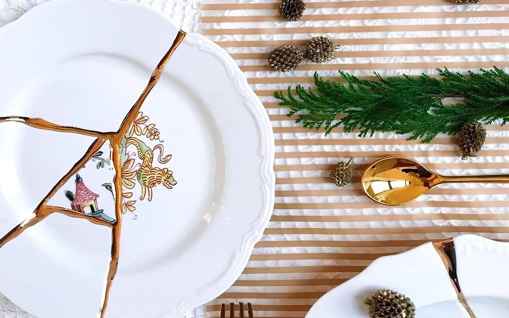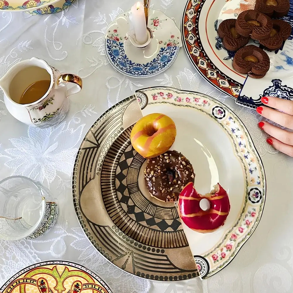 Piatti, bicchieri e posate diventano protagonisti di una tavola che non ha paura di esagerare. Gli elementi si mescolano come in un collage visivo fatto di colori accesi, contrasti audaci e dettagli dorati che catturano la luce.