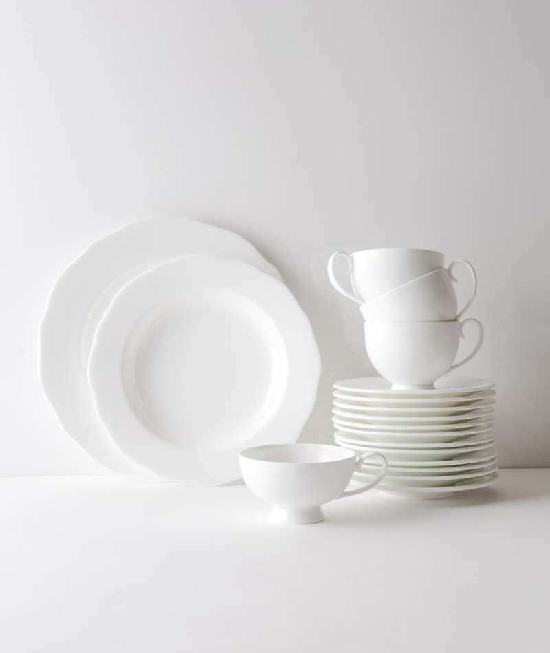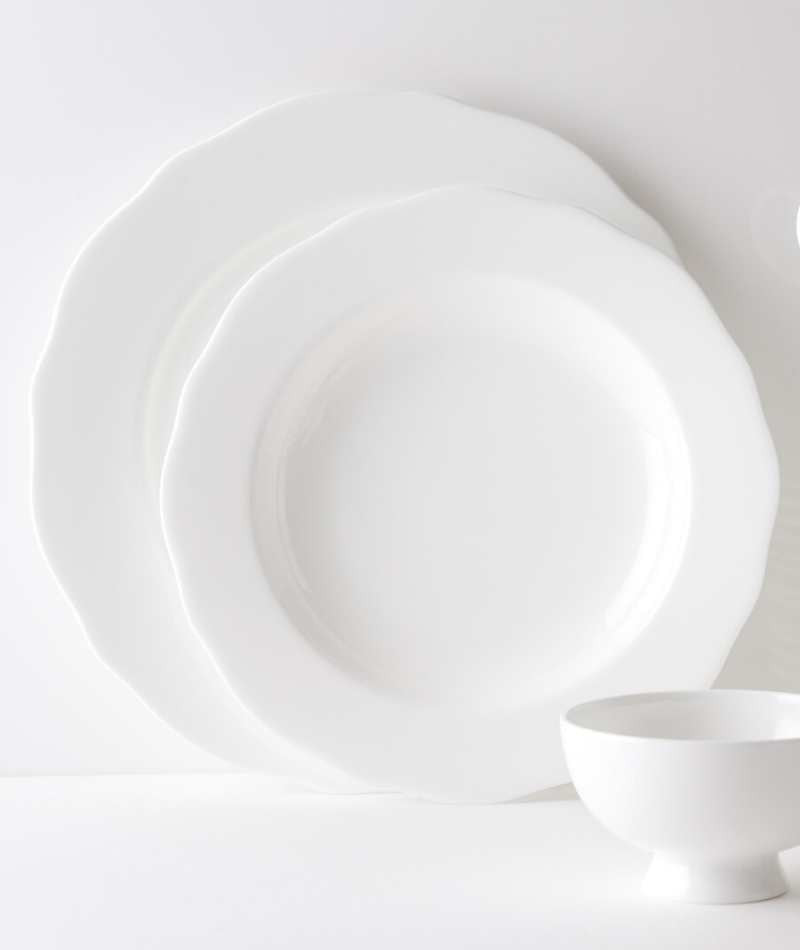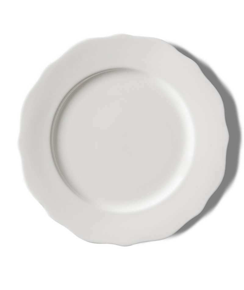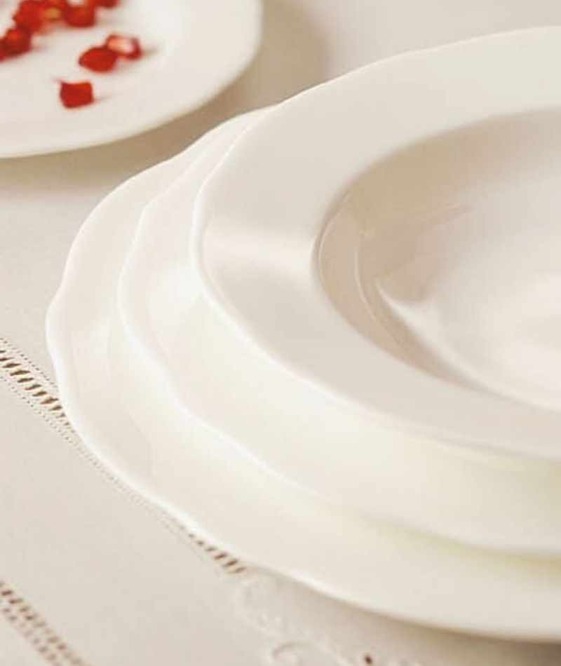 Realizzata in fine porcellana Bone China, è disponibile in tre formati: piatto piano, piatto fondo e piatto da frutta. Presenta uno stile classico che non passa mai di moda, con una forma ondulata che evoca raffinate atmosfere.