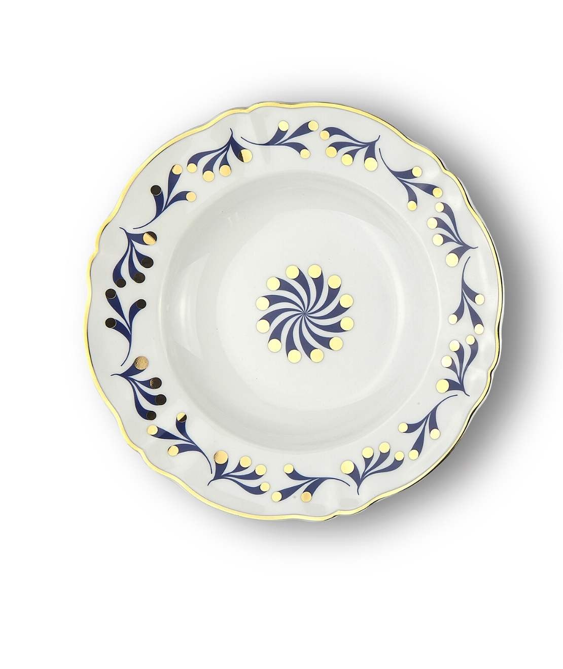 Tutti gli articoli della serie sono realizzati in porcellana bianca, con decorazioni in decalcomanie colorate e oro, e sono lavabili in lavastoviglie.