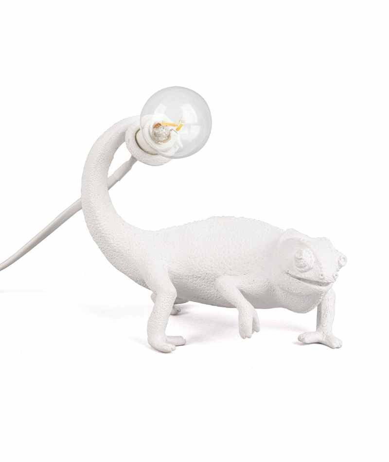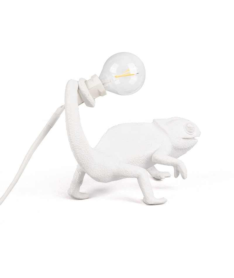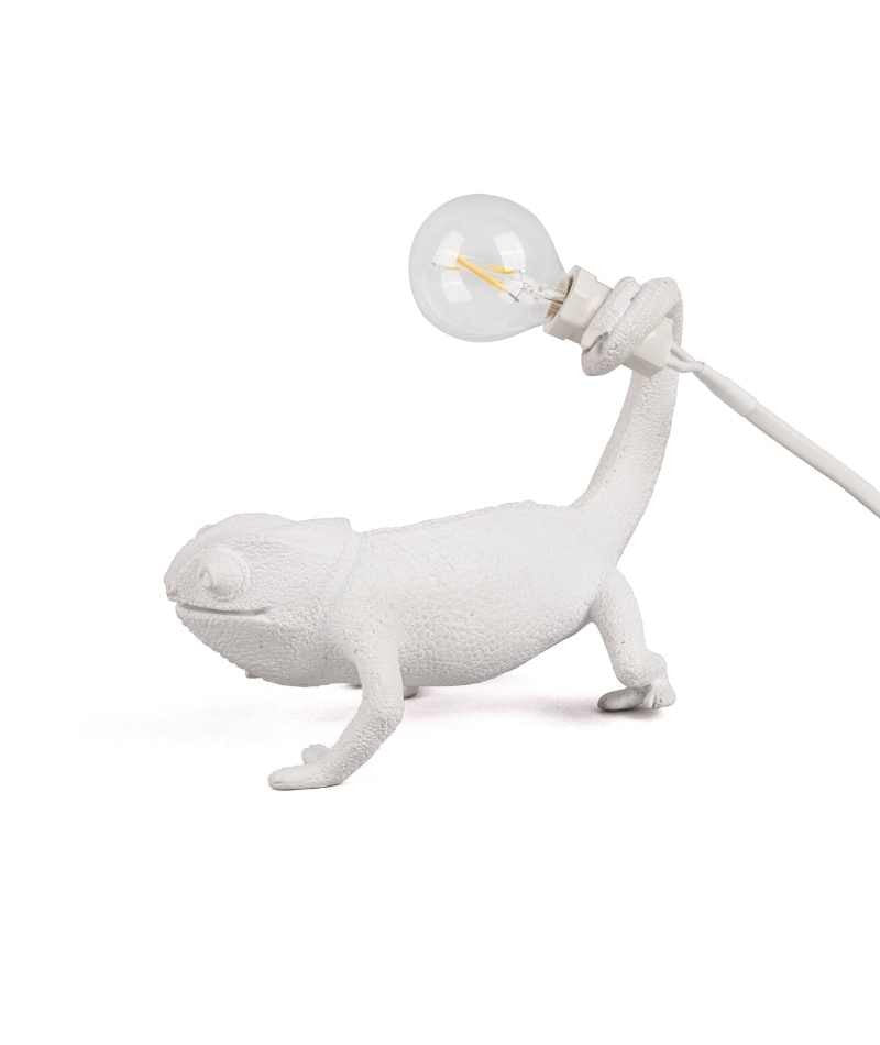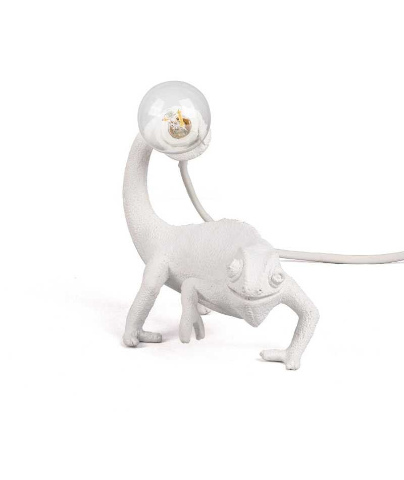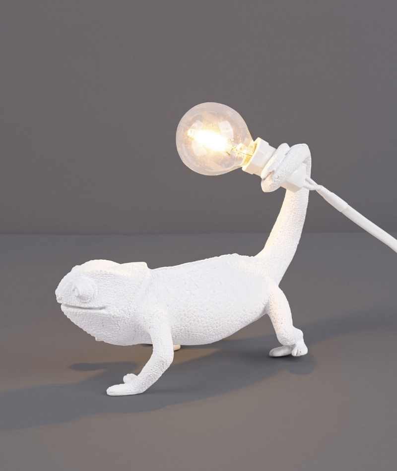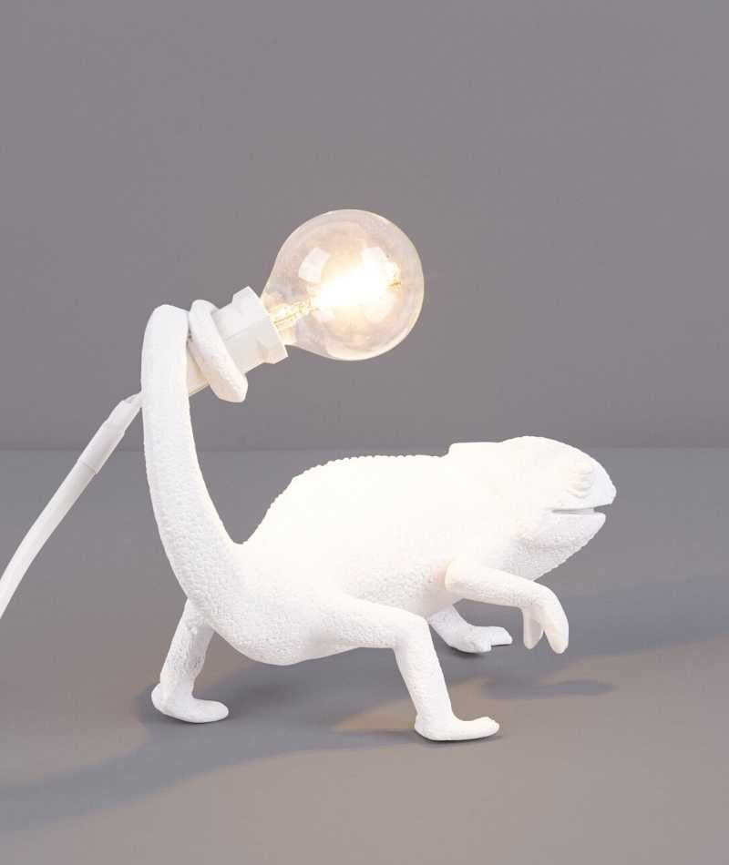 Dalla partnership tra il designer Marcantonio Raimondi Malerba e il rinomato brand Seletti, nasce la Lampada da Tavolo Camaleonte: una riproduzione realistica dell'animale, simile a una vera scultura. Realizzata in resina bianca, cattura l'attenzione ovunque venga posizionata, con il suo aspetto un po' timido e un po' impertinente, fermandosi in una divertente posa e lasciandosi osservare, con una lampadina a LED tra la coda.