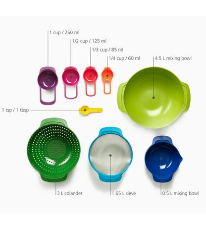 Il set include: ciotola da 4,5 litri, scolapasta da 3 litri, colino da 1,65 litri, ciotola da 0,5 litri e 5 misurini.