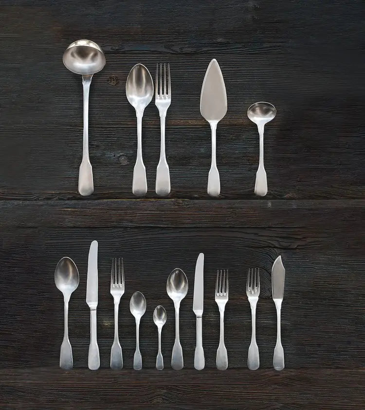 Questa finitura è ottenuta attraverso un lavaggio delle posate con pietre di porcellana, conferendo al servizio un effetto nostalgico che ricorda le vecchie posate in ferro. Una mise en place realizzata con il servizio Brick Lane è certamente destinata a essere ricordata.