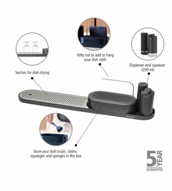 Il vassoio è dotato di una sezione separata con una griglia in acciaio inox rimovibile per asciugare le stoviglie e può anche contenere un set di dispenser per sapone.