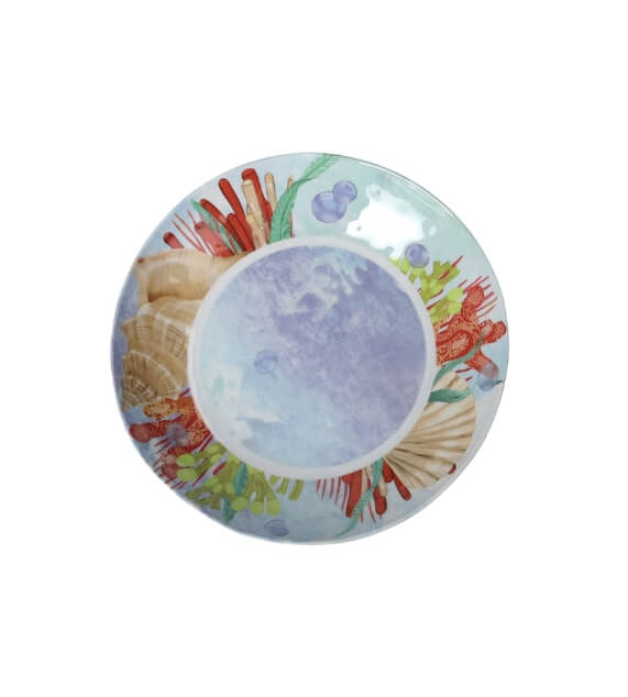 Il design del piatto è ispirato alla tranquillità e alla bellezza dell'oceano, con tonalità e motivi che richiamano il mare. Questa scelta non solo lo rende visivamente attraente, ma anche particolarmente adatto a piatti a base di pesce o a cene estive all'aperto.