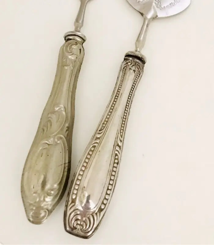 Questo set da torta vintage è composto da una paletta e una forchetta/cucchiaio placcate argento, selezionate una ad una tra posate dismesse e dimenticate, trasformate in un accessorio elegante e pieno di personalità per servire dolci e torte durante le occasioni speciali.