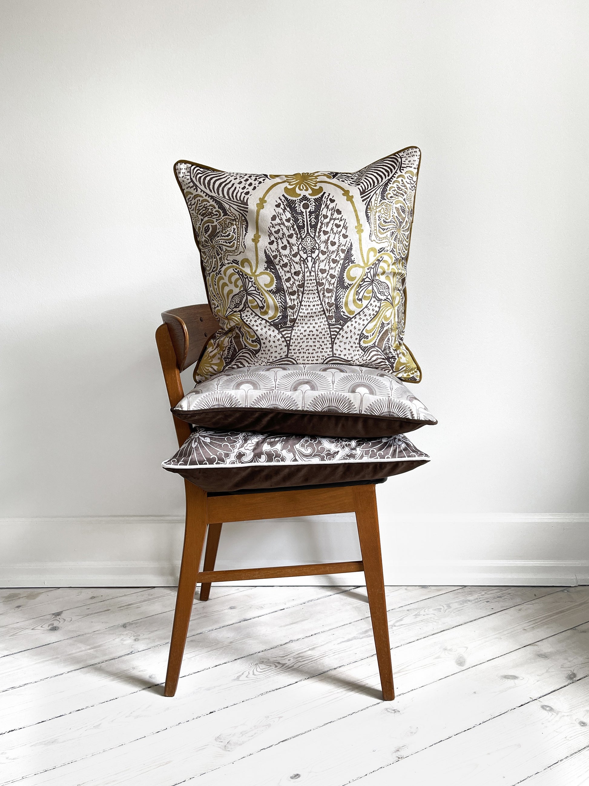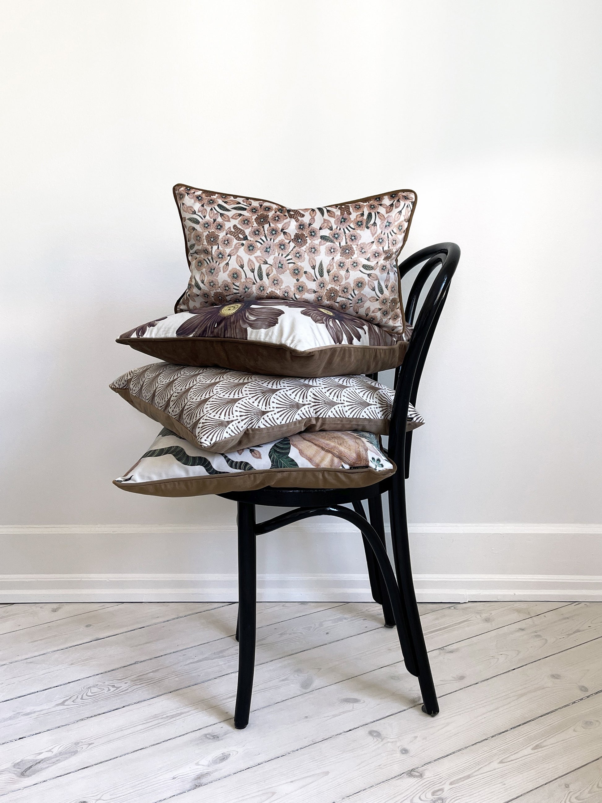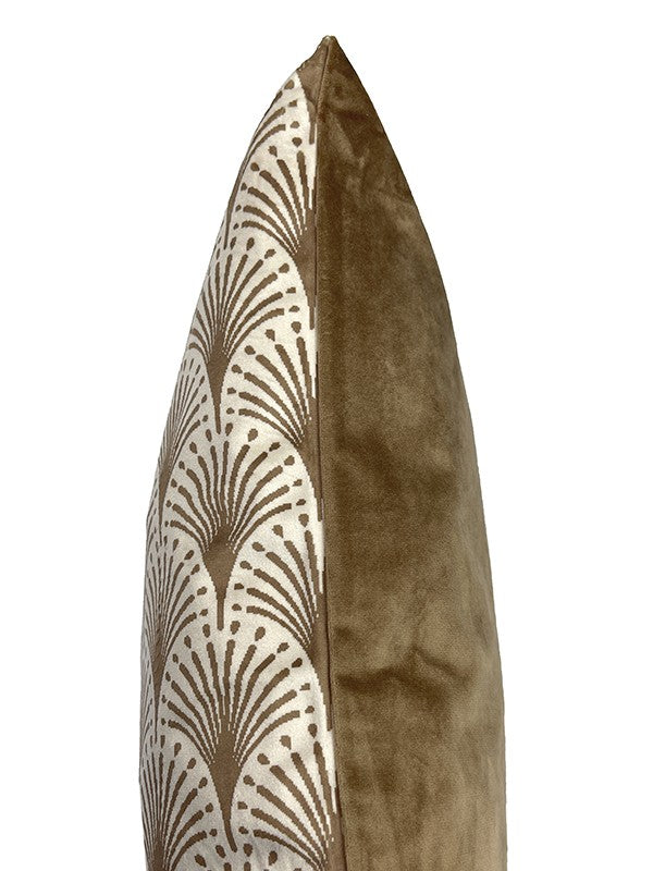 Frontale in velluto marrone con stampa “fan” stilizzata, retro velluto tinta unita: perfetto equilibrio tra decoro e sobrietà.